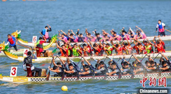 中新网佛山10月2日电 (记者 程景伟)广东省佛山市10月2日在佛山顺德区顺峰猴子园桂畔湖举办第一届F3龙舟超等联赛总决赛,24支队伍献技赛龙夺锦,配上姹紫嫣红的彩龙巡游,展现中华龙舟风姿及魔力。