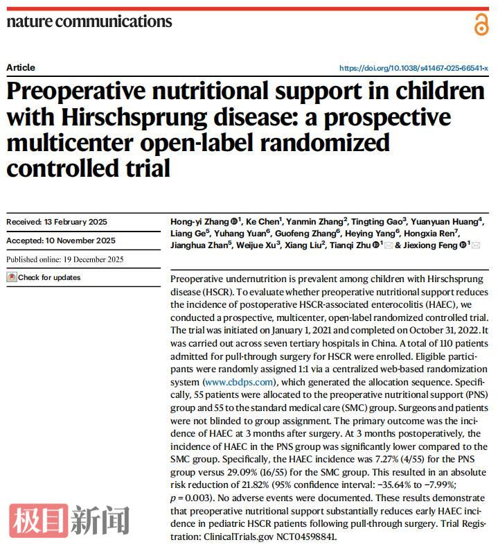 一项前瞻性、多中心当场对照考查询查诠释,术前精确制定养分补充决策,通过母乳议论高能量密度配方奶强化喂养,可使先天性巨结肠患儿术后患肠炎扫数风险裁减21.82%。此项原创询查恶果已发表于海外巨擘期刊《当然·通信》。
